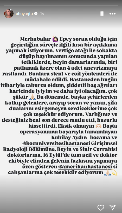 Hastaneden taburcu olan Ahu Yağtu, sağlık durumuyla ilgili şu ifadeleri kullandı: