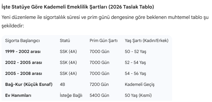 EYT düzenlemesi kapsamında yaş şartının kaldırılmasıyla birlikte, bir gün ya da bir ay farkla emeklilik hakkını kaçıranlar için “kademeli emeklilik” modeli üzerinde teknik çalışmalar devam ediyor. 2026 yılına yaklaşılırken, torba yasa beklentileri artarken özellikle 2000 sonrası sigorta girişi olan SSK ve Bağ-Kur’lular için yaş şartında esneme planlanıyor.
