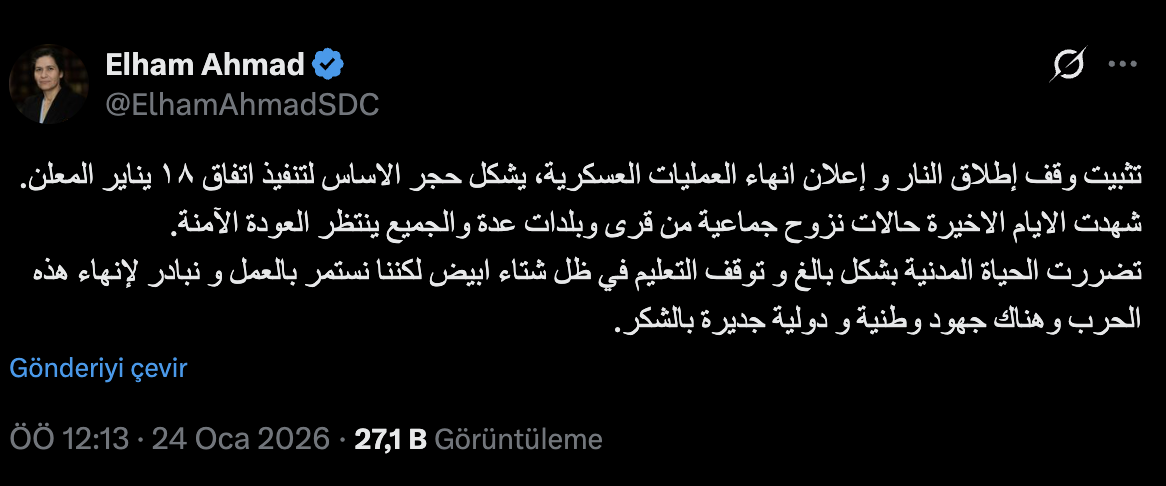 Ahmed yaptığı paylaşımda, “Ateşkesi kalıcı hâle getirmek ve askerî operasyonların sona erdiğini ilan etmek, 18 Ocak’ta duyurulan anlaşmanın hayata geçirilmesinin temel şartıdır. Son günlerde pek çok köy ve kasabadan kitlesel göçler yaşandı; herkes güvenli biçimde geri dönebileceği günü bekliyor” ifadelerine yer verdi.