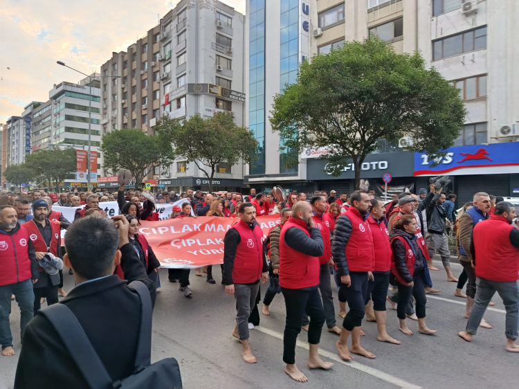 Erkan ÇAKILLI / İZMİR (İGFA) – DİSK Genel-İş Binası önünde toplanan işçiler, Kültürpark 9 Eylül Kapısı’na doğru çıplak ayakla ilerlerken, kalabalık sık sık “Haklarımız gasp edilemez” sloganları attı.