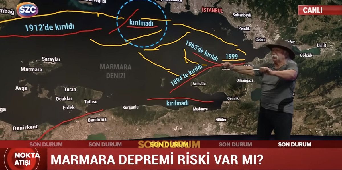Canlı yayında aktif fay hatlarına dair değerlendirmelerini paylaşan Şener Üşümezsoy, harita üzerinde Marmara için ‘riskli’ hattı anlattı.