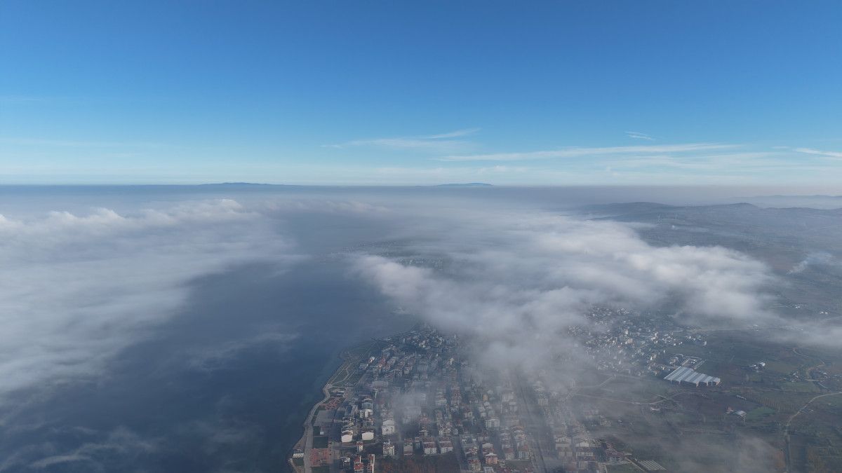 Gemiler demir bölgelerinde beklemeye başladı. 2023 metre ile dünyanın en uzun orta açıklığa sahip asma köprüsü olan 1915 Çanakkale Köprüsü’nün sis bulutu altındaki hali ise drone ile görüntülendi.