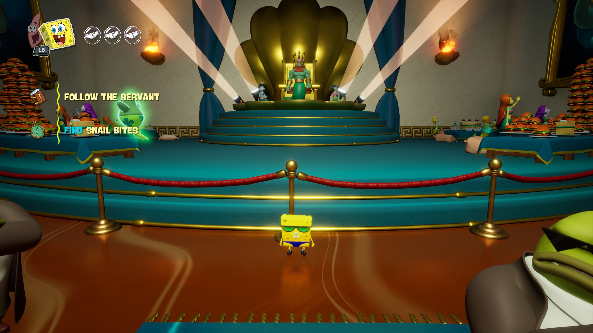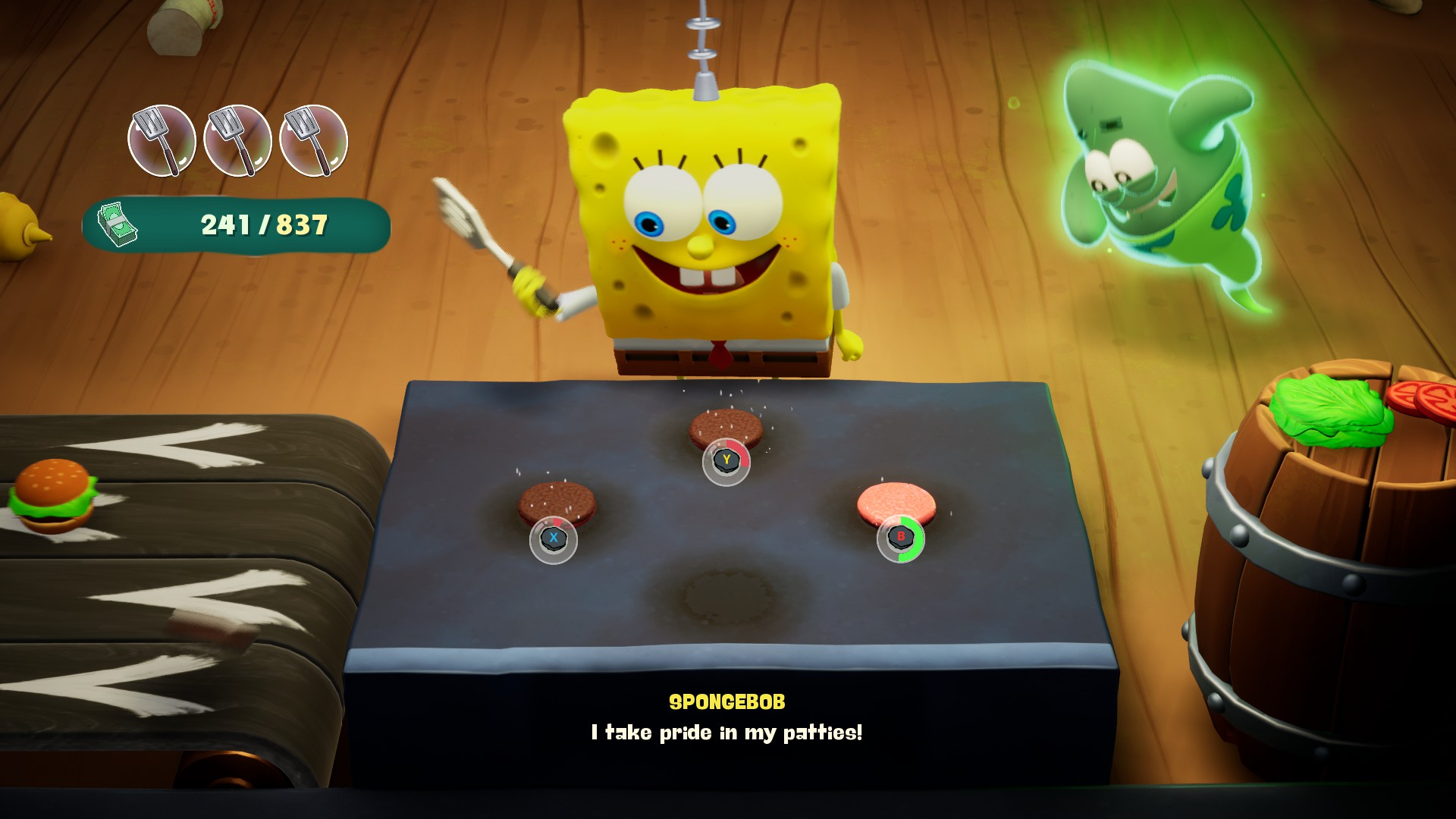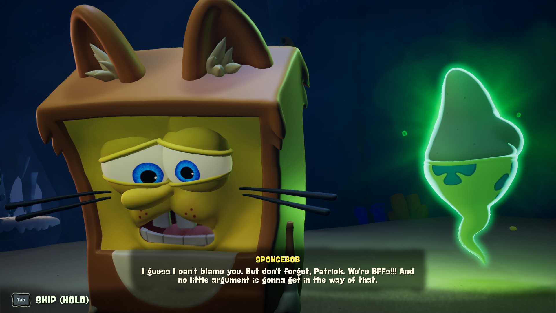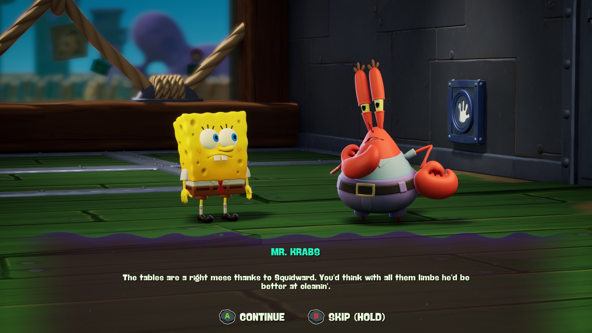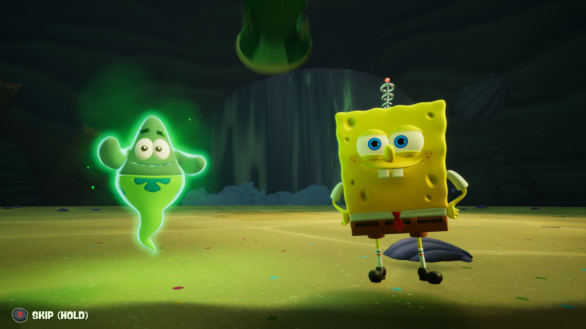 Dürüst olayım bu “filler tepişince çimenler ezilir” minvalindeki bu açılış çok hoşuma gitmişti. Hem SüngerBob’u ve Patrick’i oynanabilir karakter yapmak için iyi bir maşaydı hem de “SüngerBob mitolojisinin en önemli iki Titan’ını” bu halde görmek eğlenceliydi. Fakat bu durum çok kısa sürdü. Prolog bitince diyalogları hızlıca geçmek için kontrolcümdeki A tuşuna spam’larken buldum kendimi. B’ye basılı tutup geçmeye de kıyamıyordum, bir şey kaçırmaktan korkuyordum. Fakat sürekli şekilde A’ya basmadan da duramıyordum.