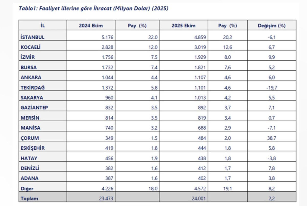 2025 yılının ilk 10 ayında, 29 ilimiz, 1 milyar doların üzerinde ihracat gerçekleştirmiştir.